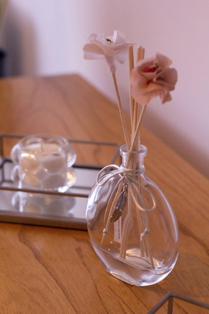 Difusor de aromas, en envase de plástico. Capacidad 125 cc. Incluye varillas de rattán color natural.
