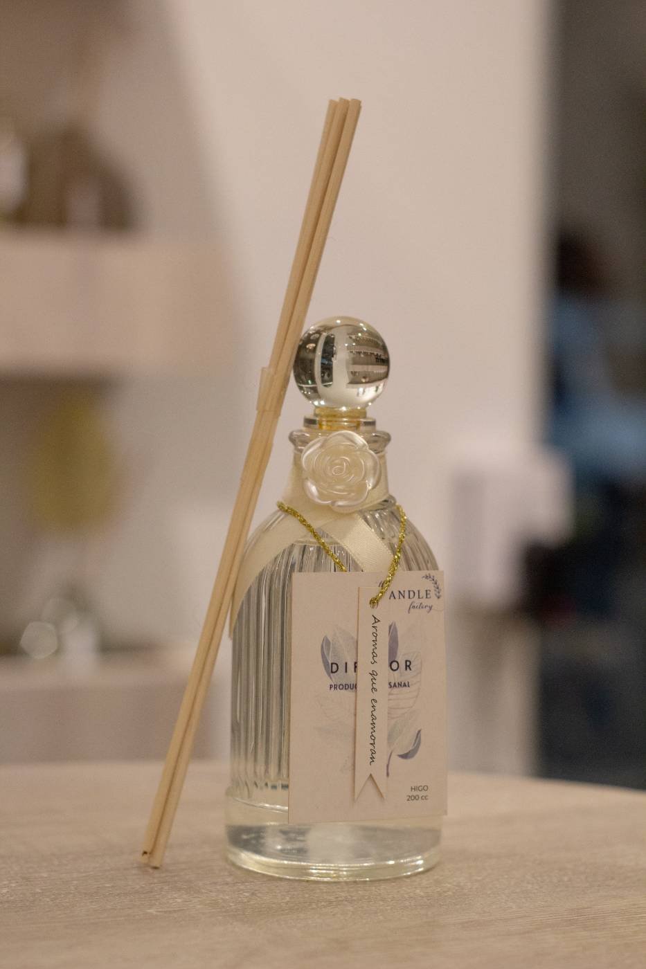 Difusor de aromas, en envase de vidrio. Capacidad 200 cc. Incluye varillas de rattán color natural y tapa de madera.