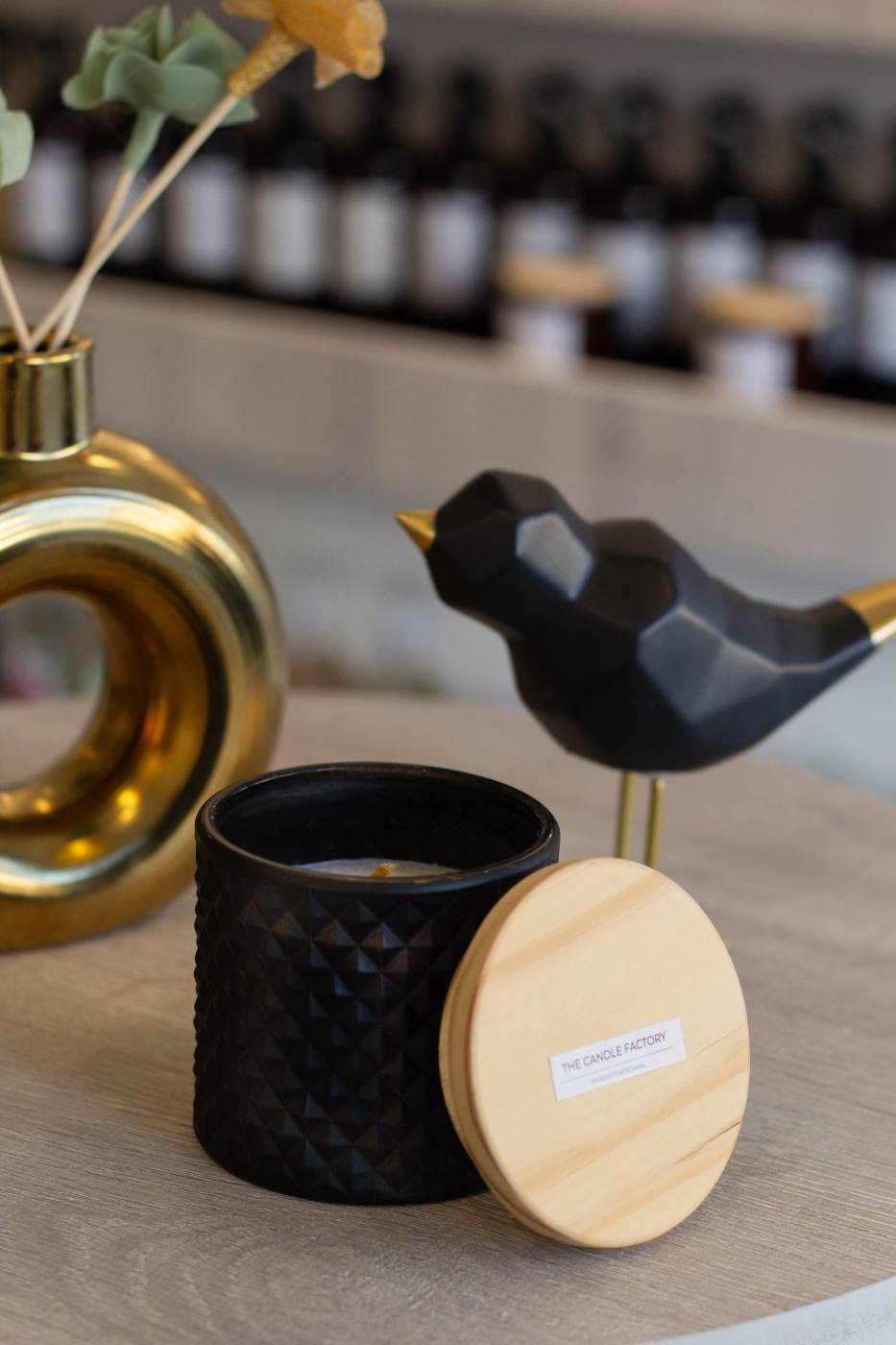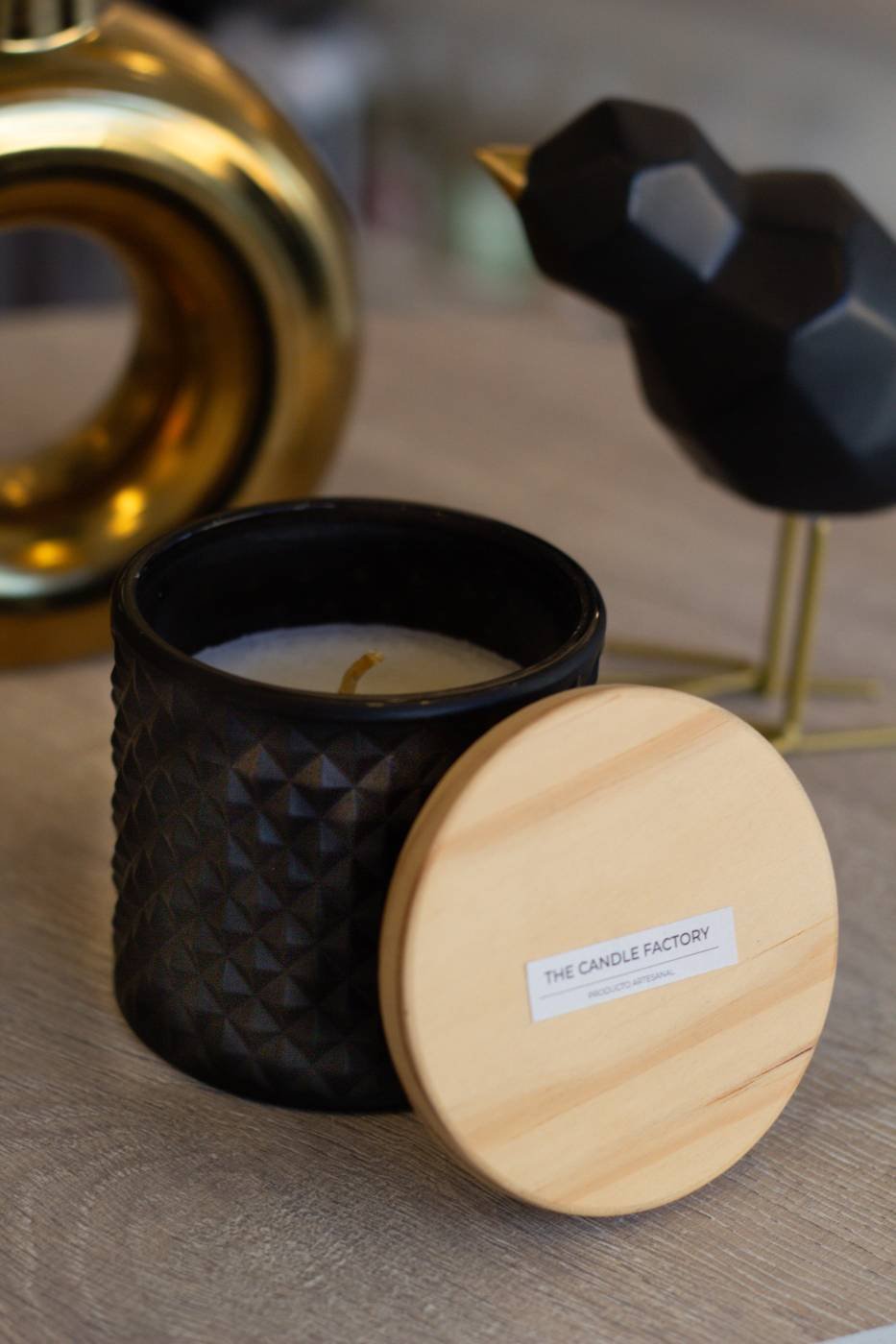 Vela aromática en envase de vidrio labrado color negro con tapa de madera. Contiene 200 gr de vela 100% cera de soja. Medidas: 9 cm de diámetro x 9 cm de alto