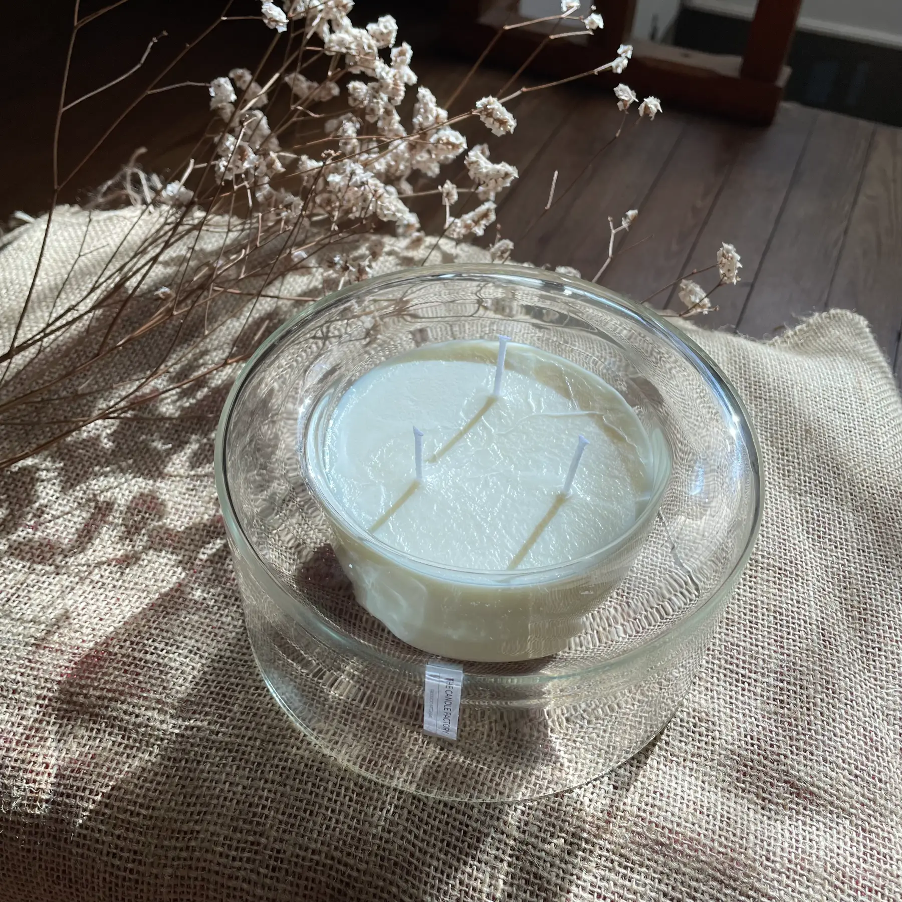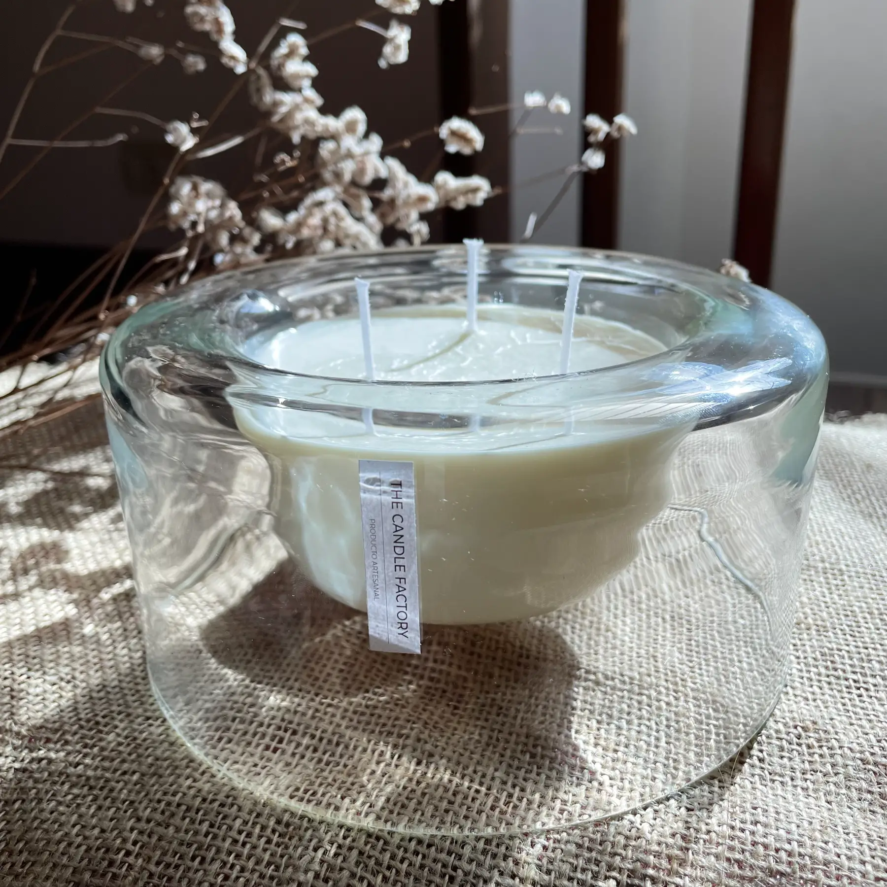 Vela aromática en envase de vidrio. Contiene 415 gr de vela 100% cera de soja. Medidas: 18 cm de diámetro x 10 cm de alto